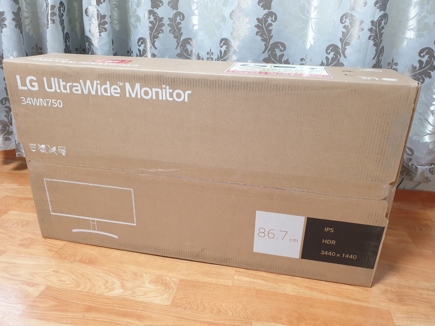 모델명은 34WN750에 스펙은 크기 34인치, 해상도 3440 * 1440의 WQHD, 반응속도 5ms, 응답속도 75hz, 연결단자로 HDMI *2 + DP * 1, 무게는 스탠드 포함 8.6kg이다.