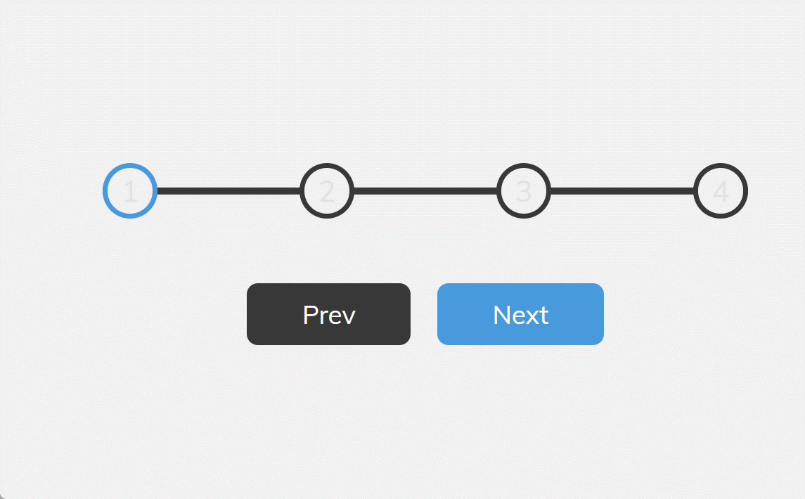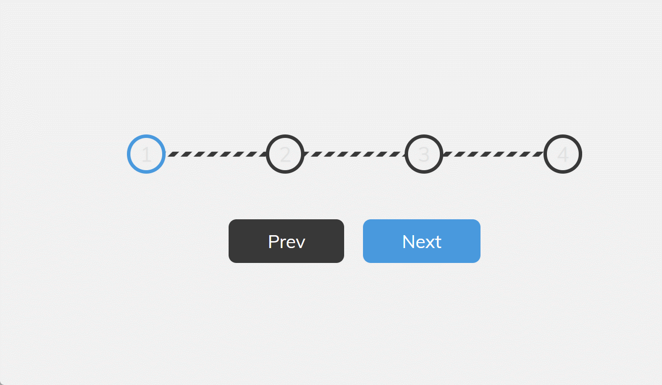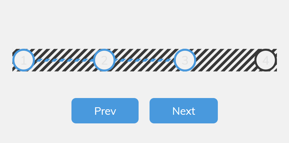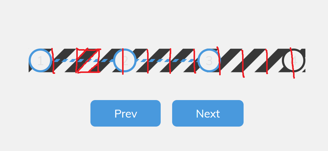진행 정도를 나타내는 기능인데, 검은색 테두리로 이루어진 원 4개가 검은선으로 이어져 있는 상태에서, "Next" 버튼을 누르면 다음 원까지 선이 진행되었다는 의미의 파랑색으로 변했고, "Prev" 버튼을 누르면 이전 원까지 파란선의 길이가 줄어든다.