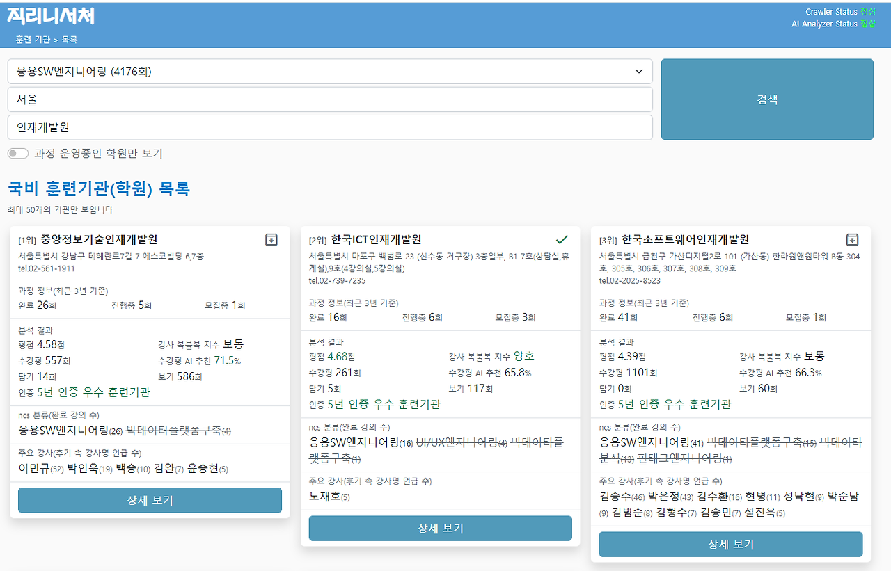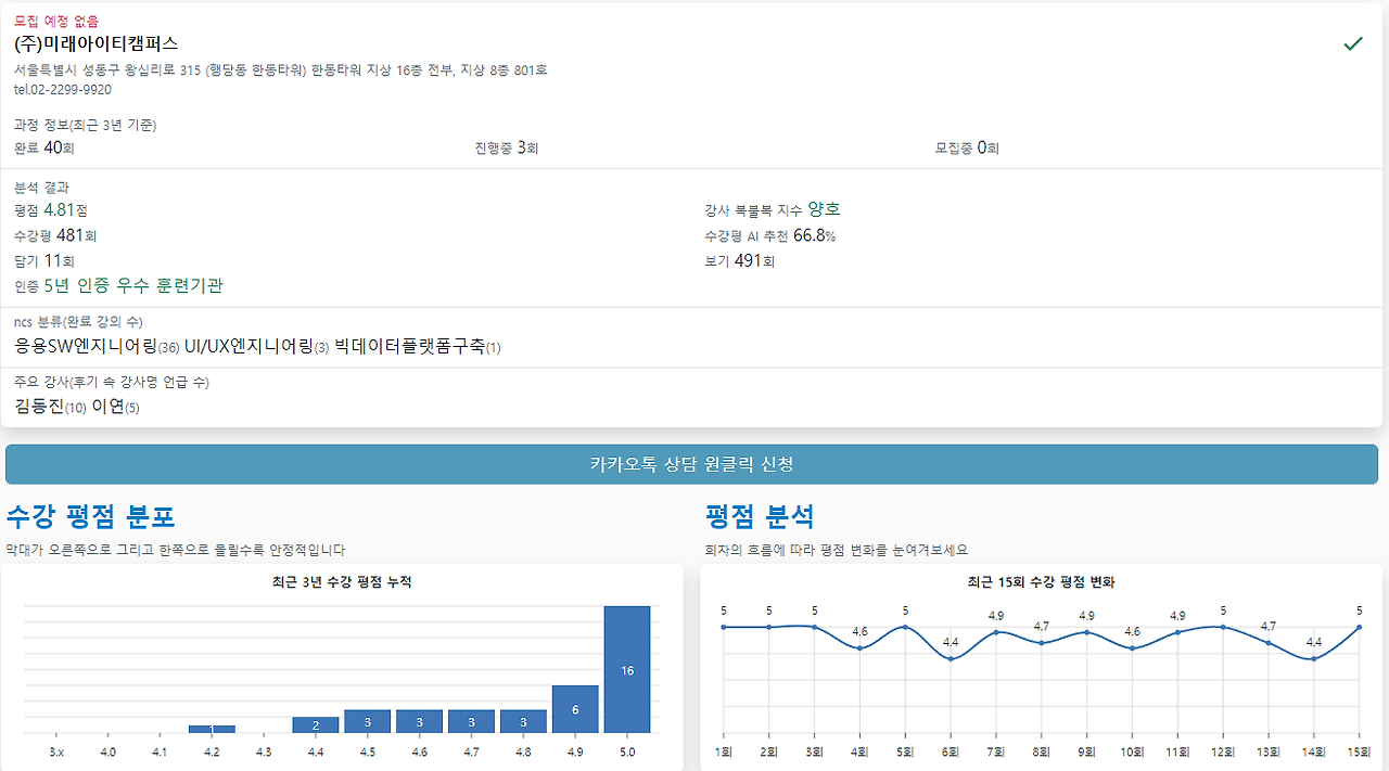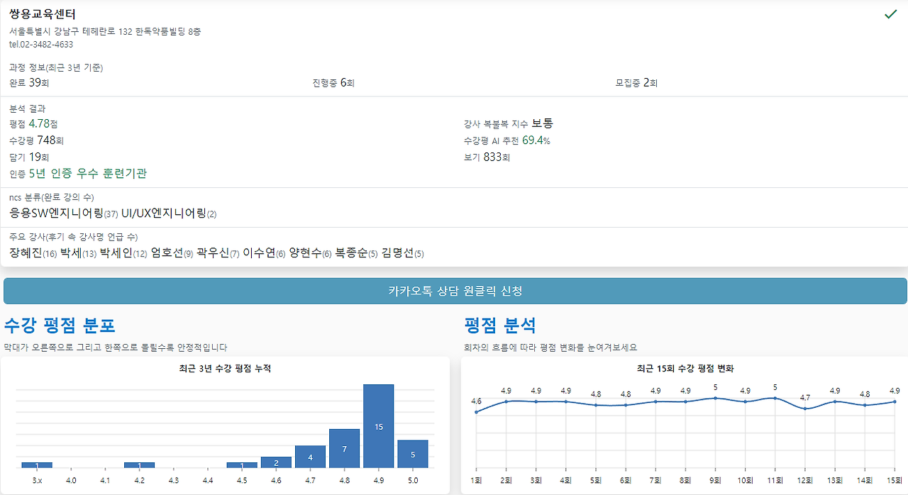 hrd net에 나온 데이터를 기반으로 해서 ai분석을 돌려 각각 수강생 후기, 강사 추천도, 수업 횟수 등과 함께 종합평점을 기록한 것이다.